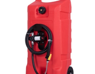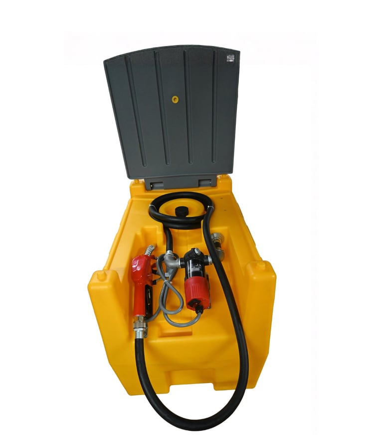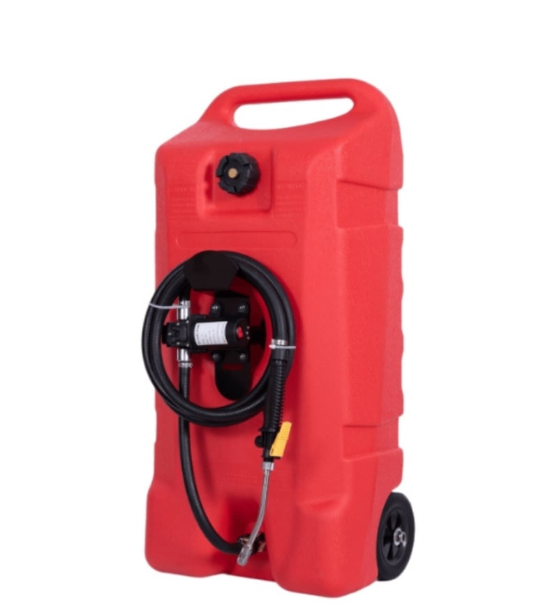 Tanque portátil para combustible con bomba manual, ideal para el abastecimiento seguro y eficiente de maquinaria y equipos en obra, con diseño resistente y fácil de transportar.