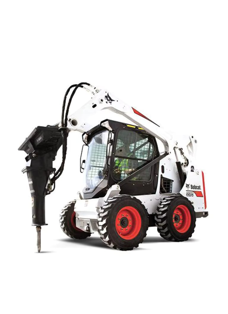 Minicargador Bobcat con martillo hidráulico, ideal para demolición y trabajos de rompimiento en concreto y superficies duras, ofreciendo potencia, precisión y alta eficiencia en obra.